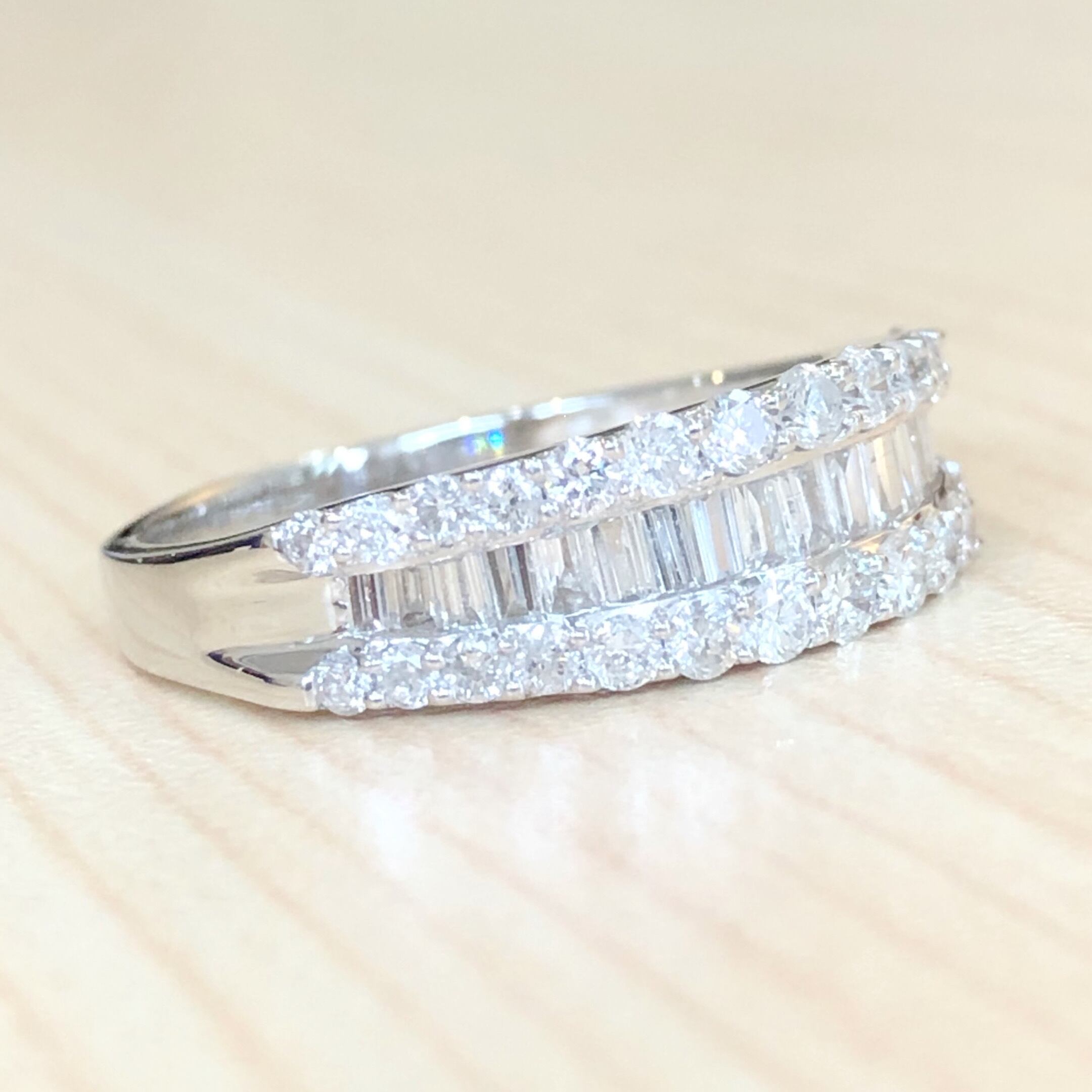 ブリリアントダイヤにテーパーカットダイヤが挟まれ、2種のカット違いダイヤの輝きのコントラストが素敵♫